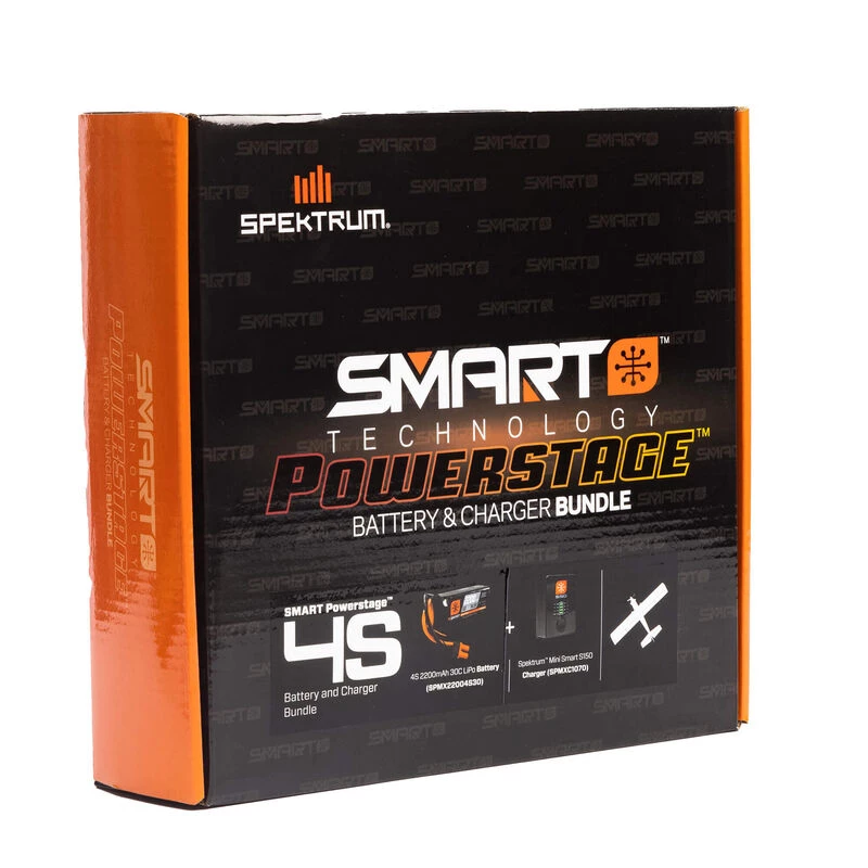 The Smart Technology Powerstage Bundle is a one-box solution for aircraft requiring top performance. Designed with the simplicity of Smart Technology, this bundle includes (1) 2200mAh 4S 30C Smart LiPo battery and (1) S150 Smart AC/DC Charger